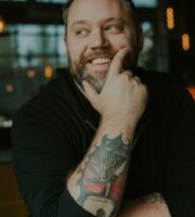 A modern, stylish restaurant interior featuring a mix of Asian cultural elements. The ceiling is adorned with a cluster of hanging, cylindrical lights, providing warm illumination. On the walls, there are large, vibrant murals, one with pink neon text saying 'THE SUSHI WAY IS MY WAY' and another depicting a woman's face with the text 'THAI LOUNGE'. Red wooden chairs surround small round tables, all set on a patterned tile floor.